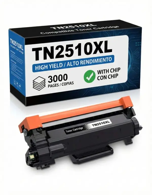 Tóner TN2510XL de alto rendimiento compatible con impresoras Brother. Diseñado para ofrecer una calidad profesional en cada impresión, este cartucho de tóner TN-2510XL / TN2510 proporciona un rendimiento optimizado y una cobertura uniforme.