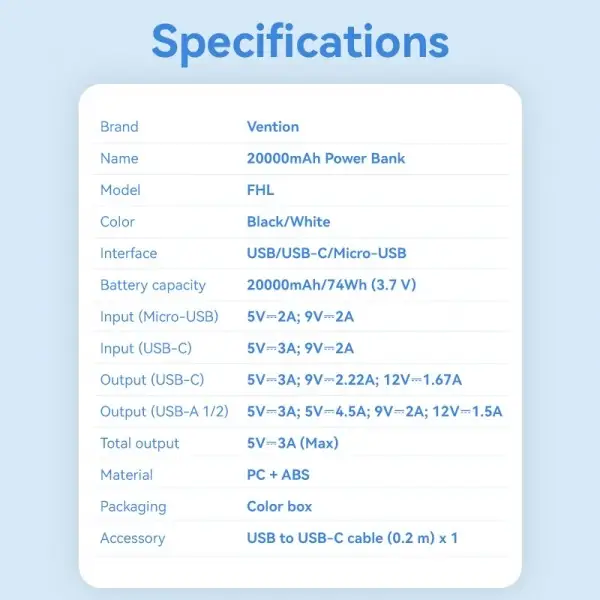 20000mAh Power Bank (Micro-USB + USB-C + USB-A + USB-A) 22.5W Negro LED Display